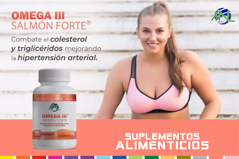 Salmón forte, es la concentración más pura de ácidos grasos como el Omega III de aceite de salmón que actúan para combatir el colesterol y los triglicéridos, mejorando las funciones circulatorias, evitando la hipertensión arterial.